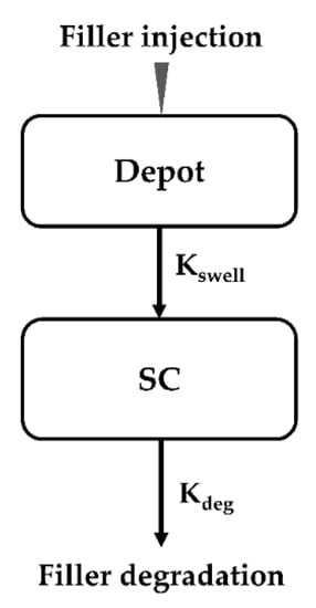 The differential equations used to describe the final dermal filler kinetic model were as follows (Equations (3) and (4)).