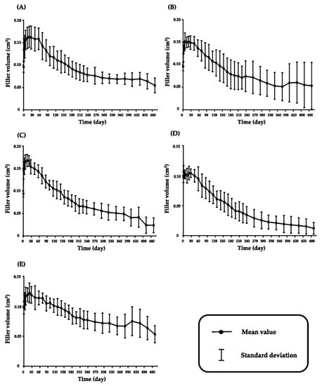 Mean volume-time profiles of 5 hyaluronic acid (HA) dermal fillers after injection in hairless mice, (A) 99 fill®; (B) Juvederm® VOLUMA with Lidocaine; (C) Neuramis® VOLUME Lidocaine; (D) Restylane® Lyft with Lidocaine; (E) YVOIRE® Contour plus.