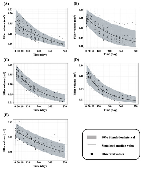 The objective of this study was to develop a mathematical kinetic model for five HA dermal fillers from different companies (99 fill®, Hanmi Pharmaceutical Co., Ltd., Seoul, Korea; Juvederm® VOLUMA with Lidocaine, Allergan Plc.; Neuramis® VOLUME Lidocaine, Medytox Inc., Cheongju-si, Korea; Restylane® Lyft with Lidocaine, Galderma S.A., Lausanne, Switzerland; and YVOIRE® contour plus, LG Chem Ltd., Seoul, Korea) and to apply this model to simulate the volume–time profile of the fillers to predict the time for complete degradation. The properties of HA dermal fillers are provided in Supplementary Materials Table S1. The in vivo characteristics and complete degradation time of five different dermal fillers were successfully predicted using the mathematical kinetic model developed in this study.