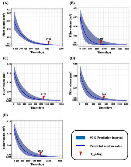 The Simulated complete decomposition time of (A) 99 fill®; (B) Juvederm® VOLUMA with Lidocaine; (C) Neuramis® VOLUME Lidocaine; (D) Restylane® Lyft with Lidocaine; (E) YVOIRE® Contour plus. Tcd, complete decomposition time.