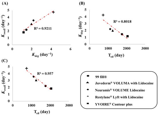 The relationship among the estimated and simulated parameters (Kswell, Kdeg, Tcd) from the 5 HA dermal filler’s kinetic model, (A) Kdeg vs. Kswell; (B) Tcd vs Kdeg; (C) Tcd vs. Kswell. Kswell, swelling rate constant; Kdeg, degradation rate constant; Tcd, complete decomposition time.