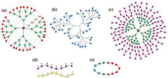 Schematic structure of (a) “star burst” dendrimer (of generation 4, G4), (b) hyperbranched polymer, (c) dendrimer multi-arm copolymer, (d) polyelectrolyte (polycation and polyanion) chains, and (e) cyclic polymer.