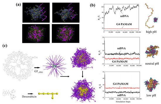 (a) Triethanolamine (TEA)-core dendrimer (top left), NH3-core dendrimer (top right) in complex with a small fragment of double-helix DNA (highlighted as a magenta ribbon). Mesoscale morphologies of the self-assembled systems between TEA-core dendrimers and DNA (bottom left) and NH3-core and DNA (bottom right) [143]. (b) Evolution of the radius of gyration (Rg) of ssDNA and G4 PAMAM dendrimer at various pH values [144]. (c) Chemical structures of dendrimer and drug molecules in DPD simulation (left), their corresponding simplified beads in the coarse-gained models (middle), and the computed G5-PEG/DOX microspheres (right) [147].