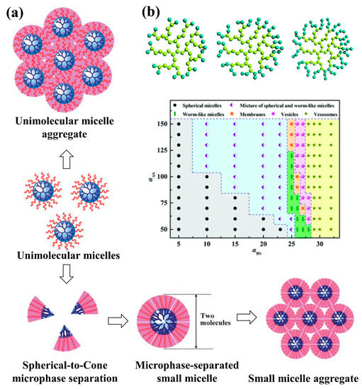 (a) Self-assembly mechanism of the microphase separated small micelle with a spherical-to-cone microphase separation [148] and inset (b) morphological phase diagram of aggregates formed from A42B20 in selective solvents as a function of the interaction parameters. A bead is hydrophobic and B bead is hydrophilic [149].