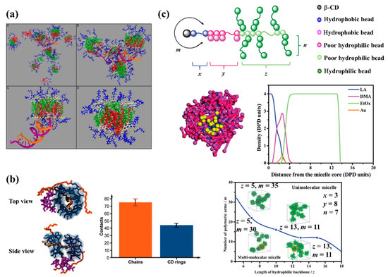 Zhang et al. [226] performed DPD simulations to study the formation process of unimolecular micelles from a β-CD-based star-like architecture created using a complex organic block co-polymer (poly(lactide)-block-poly(2-(dimethylamino) ethyl multimethacrylate)-block-poly[oligo(2-ethyl-2-oxazoline)methacrylate)(PLA-b-PDMAEMA-b-PEtOxMA). Their results predicted the formation of thermodynamically stabilized unimolecular micelles, which could stay as unimolecular micelles within a certain concentration range, indicating their potential to maintain a constant particle size and a stable structure in vivo. This would be a useful feature of an efficient drug transporter material. To prepare unimolecular micelles, a reasonable design of star-like copolymer is required. Parameters like hydrophobic or pH-sensitive chains length, shorter hydrophilic backbones length or hydrophilic side chain grafting density, and number of polymer arms, can shift the hydrophilic–lipophilic interaction balance, and non-prudent material choices can easily disrupt the formation of unimolecular micelles. The authors further examined encapsulation of small gold nanoparticles into the β-CD-based polymeric unimolecular micelles, with DPD simulations revealing that Au nanoparticles tended to distribute only in the middle PDMAEMA layer.