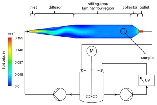 The resulting flow channel consisted of a 12 mm-diameter cylindrical inlet port on a 181 mm-long conical diffusor, followed by a 245 mm-long stilling area/laminar flow region terminated by a 5.8 mm-long collector region with a 12 mm-diameter cylindrical outlet port (Figure 2). An isometric view of the flow channel is provided in Figure A1 in the Appendix A and a construction view in the Supplementary Materials (Figure S1).