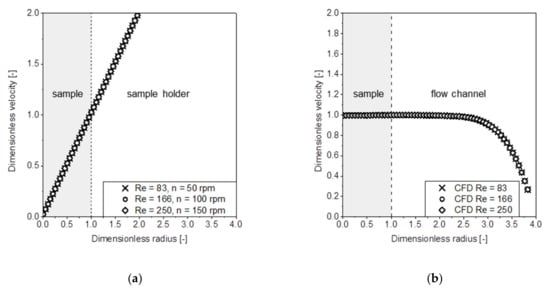 Computational fluid dynamics (CFD) simulation of the dimensionless velocity as a function of the dimensionless sample radius for the intrinsic dissolution method (a) and laminar flow channel (b), where ri = 0 is the sample center.