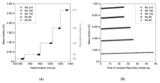 The horizontal steps in Figure 4a correspond to the Reynolds numbers shown on the secondary axis for which each set of measurements was made. The primary axis shows the mass fraction dissolved as a function of time over the course of the experiment as the Reynolds number was successively increased. Figure 4b shows the release as a function of time for the individual Reynolds numbers. Sink conditions were maintained for the entire experiment.