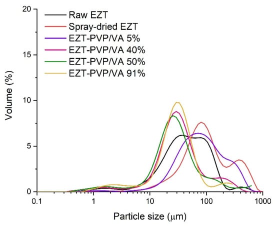 Particle size distribution of raw ezetimibe, drug spray-dried without a carrier and selected EZT-PVP/VA solid dispersions.