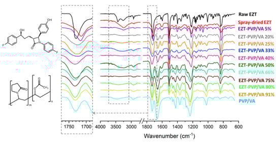 FTIR spectra of raw EZT, PVP/VA and EZT-PVP/VA solid dispersions.