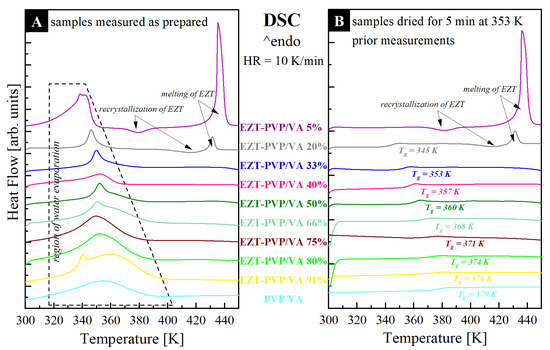 DSC thermograms of EZT-PVP/VA solid dispersions that were measured (A) as prepared and (B) before drying procedure performed for 5 min at 353 K.
