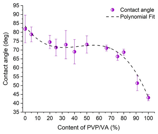 Contact angle of raw EZT and EZT-PVP/VA solid dispersions plotted as a function of the carrier concentration (circles) with fitted polynomial curve (dotted line).