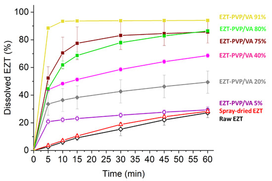 The dissolution profiles presented in Figure 7 showed a significant improvement in the EZT dissolution in comparison with the raw compound. In the case of a crystalline drug, 27.2 ± 3.5% dissolved after one hour. The increase in the amount of dissolved drug was not observed until the polymer was added. The amount of drug dissolved from the solid dispersion containing only 5% of the polymer was 10% higher than the sample containing crystalline powder, while in the case of the EZT-PVP/VA 91%, the amount of dissolved drug reached 95%.