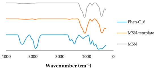 FTIR analysis was used to examine structural transformations of the templated silica nanoparticles before and after removal of template Phen-C16. Figure 2 represents the FTIR spectra (in the 200–4000 cm−1 range) of Phen-C16, MSNs with Phen-C16 within the mesopores, and bare MSNs. The expected band of sp2 C–H stretch of the template at 2917 cm−1 and the absorption decreased as it was surrounded by the silica framework. A similar trend was observed for the C=C stretch at 1610 cm−1 and C=N stretch 1448 cm−1. The FTIR peaks for the mesoporous silica nanoparticles attributed to bands of Si–O–Si asymmetric stretching, Si–O–Si asymmetric stretching, and Si–O–Si bending were observed at 1063 cm−1, 1448 cm−1, and 432 cm−1, respectively. The absence of peaks of the functional groups related to the traces of template in the MSN showed the removal of template was successful.