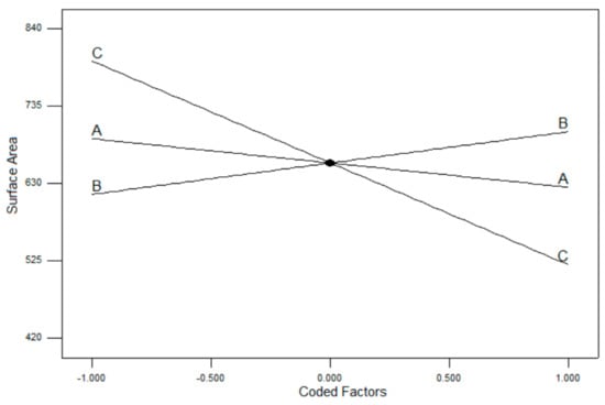 One-factor plot of coded components on the surface area. A: mass of template; B: amount of triethanolamine (TEA); C: reaction temperature.