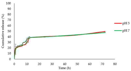 The optimized MSNs were used for in vitro evaluation of the delivery of Ru-PIP ([Ru(dppz)2PIP]2+). Ru-PIP was loaded into the pores of MSN through the absorption method. The loading percentage of Ru-PIP from a single concentration in the MSN determined from UV analysis was 18.84% ± 0.1%. The in vitro drug release of Ru-PIP@MSNs was monitored in neutral and acidic conditions for 72 h. Ru-PIP had a burst release in the initial first hour, with a decreased rate from 1–11 h (Figure 6). A gradual release 11–72 h was then seen. A slightly reduced rate of release was observed from 1–11 h at pH 5 compared to neutral pH, and the cumulative release at 72 h of Ru-PIP in pH 5 and pH 7 were 49.31% and 47.51%, respectively. Although the release rate at 72 h was slow, the increment that was observable indicated that MSNs support a continuous release of Ru-PIP, even after 72 h.