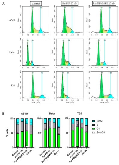 In the case of MSN-delivered Ru-PIP, cells were treated with sub-IC50 concentrations of Ru-PIP (20 µM, labeled as “Ru-PIP@MSN 20” in Figure 8B). In response to this treatment, A549, Hela, and T24 cells showed similar increases in cell accumulation in G1 phase compared to control. Meanwhile, only a small arrest at the sub-G1 phase was observed for A549 and T24. From the DNA content histogram, the changes in peaks in the cell cycle distribution for free Ru-PIP was obvious, whereas the peaks for Ru-PIP@MSNs more closely resemble the control cells, with a slight broadening of the G1 population.