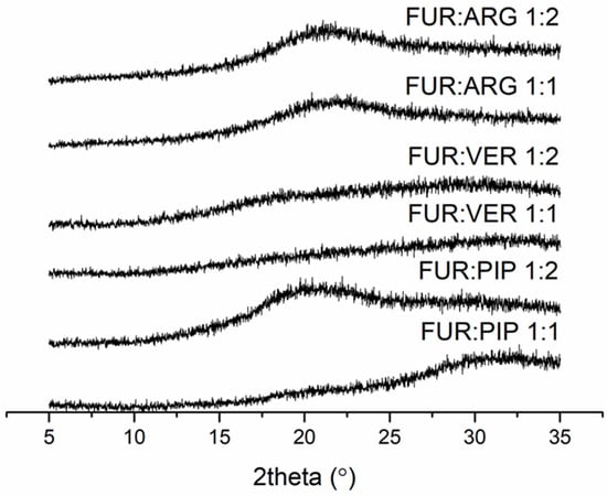 The FUR mixtures with ARG (prepared by spray drying), PIP and VER (prepared by evaporation) at 1:1 and 1:2 molar ratios were amorphous according to XRPD (Figure 1). Instead, the mixtures with QRT (prepared by evaporation) remained crystalline at both molar ratios (the X-ray diffractograms along with those of the starting materials are shown in Figure S2 in the Supplementary Materials).