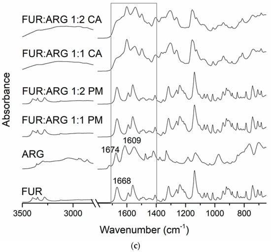 In the case of the ARG mixtures (Figure 2c), salt formation was observed, as expected. The disappearance of the unbound COOH group signal of FUR (at 1668 cm−1 in crystalline FUR) together with changes in the guanidine structure of ARG (1674 and 1609 cm−1 in crystalline ARG) have previously been reported as confirmation of salt formation between the components [,].