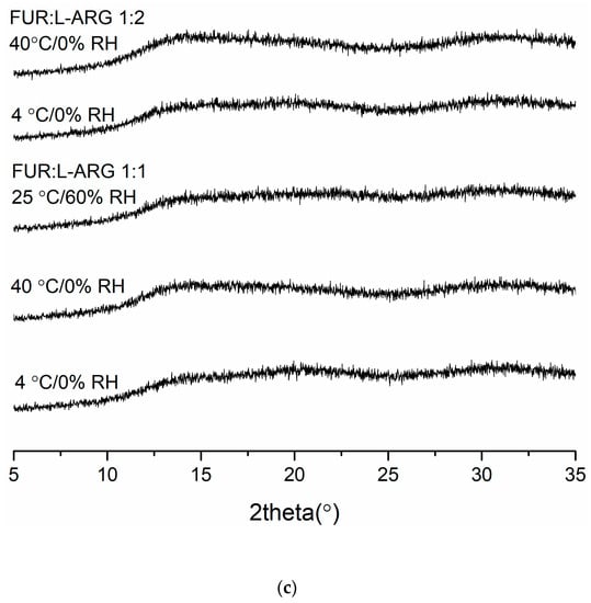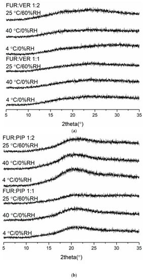 The X-ray diffractograms of the co-amorphous mixtures stored at 4 °C/0% RH, 40 °C/0% RH and 25 °C/60% RH are shown in Figure 3. The samples were found to be physically stable during the entire storage period (eight weeks for FUR:VER and FUR:PIP, and nine weeks for FUR:ARG). However, when the FUR:ARG 1:2 mixture was stored at 25 °C/60% RH, it transformed into a sticky material in less than one week; thus, it was not investigated further. Similar hygroscopic behaviour has been observed with other amorphous ARG salts, such as spray-dried ibuprofen:ARG and indomethacin ARG []. Furthermore, the FTIR spectra (Figure S5) also support the XRPD results, as none of the mixtures exhibited any changes during storage. Thus, all the mixtures were able to stabilize amorphous FUR, as the pure drug has been found to recrystallize within two weeks when stored at 25 or 40 °C [] and four days when stored at 22 °C/33% RH []. This could be attributable to the increased Tg values of the samples and intermolecular interactions between the components [,], especially salt formation between the ARGs and FUR [,].