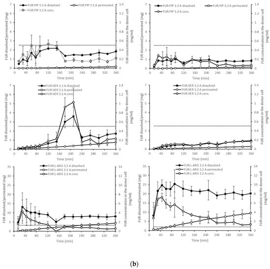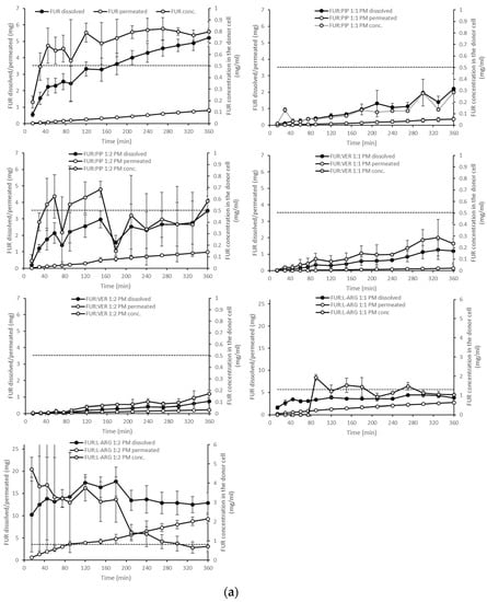 The dissolution test showed clearly that in the case of the PMs, the dissolution of FUR from the FUR:PIP and FUR:VER mixtures was lower when compared to that with crystalline FUR alone (Figure 4a). This is in accordance with the results from the equilibrium solubility tests (Table 2). Instead, ARG had a positive effect on the dissolved amounts of FUR. It seems that the equilibrium solubility was exceeded in the FUR:ARG 1:2 mixture. After reaching supersaturation, the FUR concentrations declined back to the level of equilibrium solubility. This may be due to in situ amorphization, which has been observed to occur for ARG and different drug molecules [,].