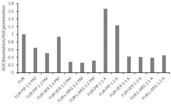 The ratio between the areas under curves for dissolution (AUCdissolution) and for permeation (AUCpermeation) for the mixtures, divided by the ratios, for crystalline FUR.