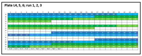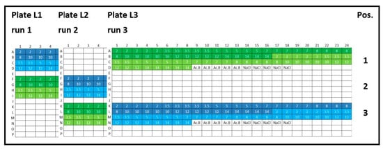 Experimental plate design for inter-plate variability. Lysozyme (L): three 384-well plates were analyzed (run 1, run 2, and run 3), and the concentration series was arranged horizontally (2, 5, 10, and 14 mg/mL). Lysozyme batch types: LysSig2243 (blue), +400-mM NaCl (cyan) and LysSig5161 (green), +400-mM NaCl (light green). Control samples were placed in row P: Ac.B: 20-mM acetate buffer, pH 4.5, and NaCl: 400-mM of sodium chloride in acetate buffer, pH 4.5.