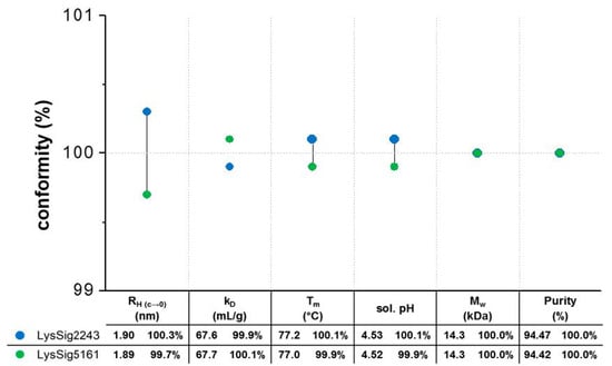 Prior to the statistical evaluation, the lysozyme batches were investigated for their batch conformity. Accordingly, both batches showed equal hydrodynamic, thermodynamic, and physicochemical properties, resulting in identical molecular weights and equal denaturation temperatures (Tm), solution pH values, and purities (Figure 3). The ACFs were smooth exponentials with a baseline of ~1.00 and low SOS (sum of squares) values (<20) (Supplementary Materials, Tables S1 and S2), demonstrating monomodal size distributions with low polydispersity and good-quality decays during the DLS experiments. The single-particle hydrodynamic radii (RH(c→0)) by DLS were determined by extrapolating the RH to an infinite dilution (c 0) using lysozyme concentrations ranging from 2–7 mg/mL. The single-particle RH(c→0) for the lysozyme monomer in 20-mM acetate buffer at pH 4.5 was determined as 1.9 nm. In the presence of 400-mM NaCl, the RH(c→0) was 2.0 nm [29,30,31]. The kD values were calculated from D obtained from four concentrations (2, 5, 10, and 14 mg/mL lysozyme), three runs, five replicates per run, and three plate positions (total of 9 kD for each lysozyme batch). The ANOVA also showed no significant differences (p = 0.226) between the batches.