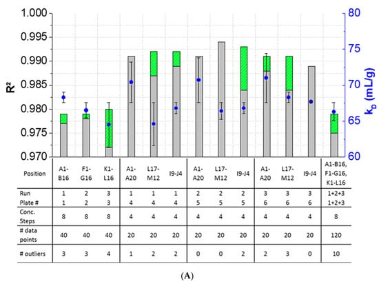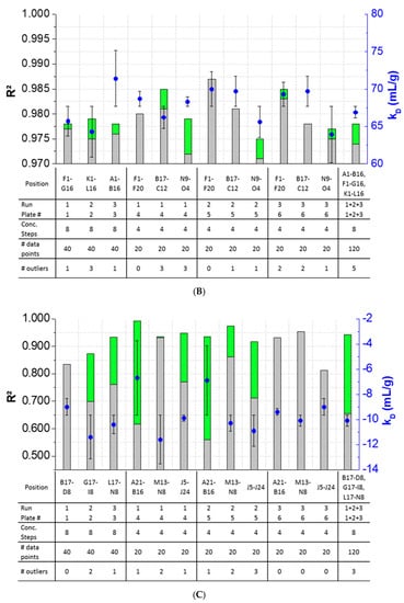 Inter-plate variability studies are time- and material-consuming and, thus, difficult to include in general predevelopment studies of drug candidates. Therefore, the following two plate design recommendations (Figure 11) were optimized, using as little of the API as possible without a loss of data integrity. The exclusion of edge wells (i.e., rows A and P (2 × 24 wells) and columns 1 and 24 (2 × 16 wells)) is highly recommended, and our study revealed a reliable kD analysis based on four API concentration steps instead of 6–10 [6,40,41,42,43]. However, the lowest and highest concentrations should be considered carefully, while intermediate concentrations may be omitted in order to save the API. Our results suggested an association between the time elapsed and kD values. A vertical sample arrangement of five replicates is preferred, since an improved precision of the diffusion coefficients was achieved. Low concentration samples should be positioned on upper rows to minimize the effect of evaporation during data acquisition. Edge well (i.e., rows A and P (2 × 24 wells) can be optionally filled with liquid (e.g., water or buffer) for additional thermal insulation and, thus, for reducing the effect of evaporation of the neighboring sample wells. An outlier test should be applied to detect and exclude outliers within the datasets, since the curve progression can be affected positively (R2 > 0.9).