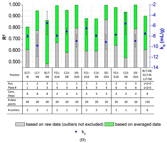 Variations of the coefficients of correlation (R2) as a function of the excluded outliers and number of data points for: positive kD: (A) LysSig2243 and (B) LysSig5161 and negative kD: (C) LysSig2243+NaCl and (D) LysSig5161+NaCl. An increase of R2 (based on the excluded outliers) is indicated by stacked green bars. The table contains the plate position, run, and plate number according to Figure 1; Figure 2; number of concentration steps (2, 5, 10, and 14-mg/mL or 2, 3.5, 5, 7, 8, 10, 12, and 14-mg/mL Lysozyme); used data points for the kD analysis; and number of detected outliers by the Grubbs’ test. Corresponding kD values are shown as blue spheres on the secondary y-axis. Error bars represent the deviation compared to the overall average kD collected for all runs and plates.