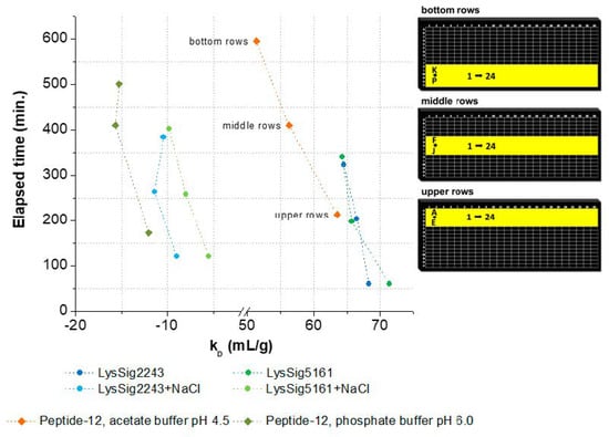kD as a function of elapsed time and the corresponding plate positions (bottom, middle, and upper rows). Spheres present kD collected for lysozyme, and squares show kD collected for peptide-12 in acetate, pH 4.5 (orange), or phosphate, pH 6.0 (olive green), buffer. kD was calculated using the wells as highlighted in yellow on the right-hand side. Exact well numbers can be found in Appendix B.