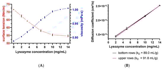(A) Surface tension and dynamic viscosity data as a function of the lysozyme concentration. Red spheres present the surface tension determined by the Wilhelmy plate method, and viscosity data are shown as blue spheres on the secondary y-axis. Error bars represent the standard deviation of 4 measurements. Error bars are possibly smaller than the symbols. (B) Diffusion coefficient as a function of the lysozyme concentration and plate position. The red line represents D collected in upper rows, and the black line represents D collected in the bottom rows. Error bars represent the standard deviations of 6 measurements for the diffusion coefficients by DLS.