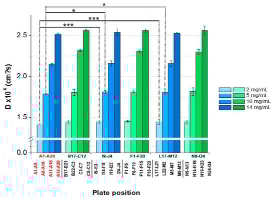 Statistical evaluation (intra-plate coefficient of variation (CV)) with regard to the diffusion coefficients as a function of plate position collected for two lysozyme batches (LysSig2243: blue and LysSig5161: green); 4 concentrations (2, 5, 10, and 14-mg/mL lysozyme); and 5 replicates. Edge rows (A1–A20) are marked in red. The plate design is shown in Figure 1. Significant differences are indicated by asterisks: * p < 0.05 and *** p < 0.001.