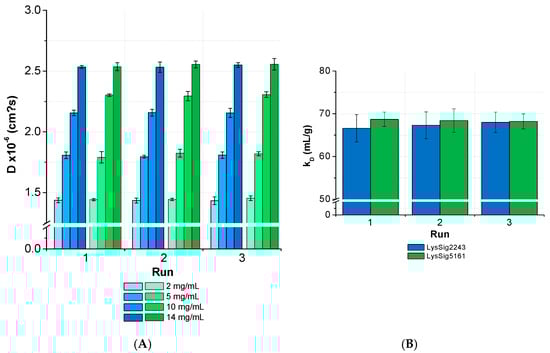 The ANOVA revealed no significant differences (p < 0.05) between the D and kD collected from several runs and by separately analyzed plates for lysozyme (Figure 9). The overall CV was < 3% for the samples with low, medium, and high lysozyme concentrations (LysSig2243 and LysSig5161). The ANOVA of the formulations containing sodium chloride provided similar results and, thus, a significant run-to-run consistency. The average CV of the diffusion coefficients for samples with low, medium, and high lysozyme concentrations were 3.2% (LysSig2243+NaCl) and 2.9% (LysSig5161+NaCl). The highest CV between different concentrations were 3.9% and 3.5% (LysSig2243+NaCl and LysSig5161+NaCl, respectively). The ANOVA also revealed no significant differences between the runs.