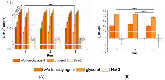 Statistical evaluation (inter-plate CV) with regards to (A) diffusion coefficients collected for three peptide-12 formulations in acetate buffer, pH 4.5, in the absence or presence of tonicity agents (w/o tonicity agent: dark orange, glycerol: orange, NaCl: slight orange) concentrations (in ascending order: 2, 4, 6, 8, and 10-mg/mL peptide-12); 5 replicates; and 3 runs. Significant differences are indicated by asterisks: *** p < 0.001. The plate design is shown in Appendix A, Figure A2. (B) The kD obtained from the D of 5 concentrations (2, 4, 6, 8, and 10-mg/mL peptide-12) and 5 replicates at 3 plate positions collected in 3 separate runs (9 total kD of each formulation).