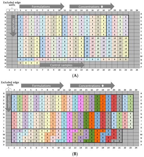 Plate design recommendations for kD determination and the screening of prototype formulations. (A) “Low risk”: 8 formulations (marked by blue to yellow), based on a horizontally arranged concentration series (2, 4, 6, 8, and 10-mg/mL API), and 6 replicates of each concentration are positioned vertically (=240 sample wells, elapsed time (well B3 → M22): 5 h). Control samples are optionally placed at the end positions. Total net amount API: 44 mg. (B) “High quantity”: 20 formulations (marked by blue to gray), based on a horizontally arranged concentration series (2, 5, and 10-mg/mL API), and 5 replicates of each concentration are positioned vertically (=300 sample wells, elapsed time (well B2 → O21): 6.25 h). Placebo samples are not placed on the microtiter plate. Total net amount API: 50 mg.