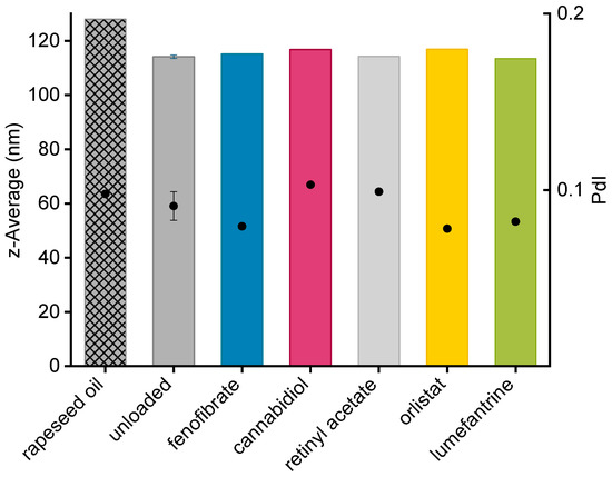 Droplet size (z-Average, represented as bars) and polydispersity index (PdI) values (PdI, represented as dots) of different batches of unloaded trimyristin emulsions (n = 6 ± standard deviation), drug-loaded donor emulsions (also with trimyristin matrix) as well as the rapeseed oil emulsion (patterned bar) as determined via photon correlation spectroscopy.