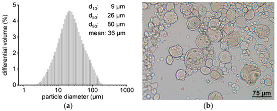 (a) Particle size distribution (determined via LD) of an exemplary microsphere batch that was used for fenofibrate transfer. (b) Light microscopic image of the same microbeads batch.