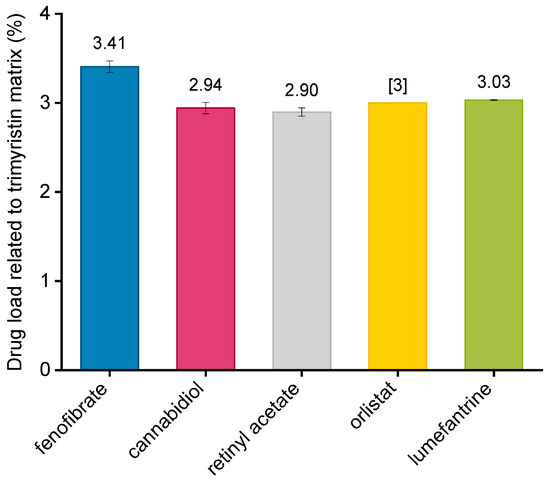Depending on the drug, loading into nanoemulsions was performed either by dissolving the drug in the melted trimyristin prior to homogenization (fenofibrate, orlistat, retinyl acetate, lumefantrine) or after preparation via passive loading (cannabidiol). The respective drug loads are shown in Figure 3. All drugs were loaded in a concentration of ~3% in relation to the trimyristin matrix. It should be kept in mind that the given concentration of orlistat is not the actual value since it was not possible to determine orlistat by UV spectroscopy due to an insufficient light absorbance of the drug in presence of trimyristin. This does not affect the accuracy of the calculated amount of transferred orlistat as explained in Section 2.9. None of the drugs displayed significant adsorption to the PES filter membrane since recovery after filtration was close to 100% for all drugs (data not shown).