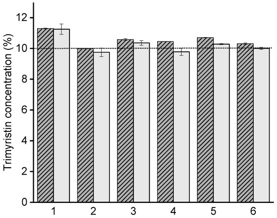 Comparison of trimyristin quantification of six different unloaded nanoemulsions via DSC (patterned bars; n = 3 ± standard deviation) and HPLC (uniform bars; n = 4 ± standard deviation). The dotted line represents the weighed-in amount.