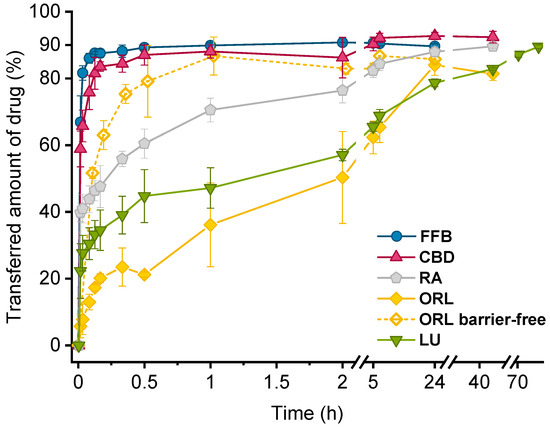 In the following, all transfer results are presented by plotting the fraction of transferred drug (%) against the time (hours, h). All transfer studies were performed in triplicate.