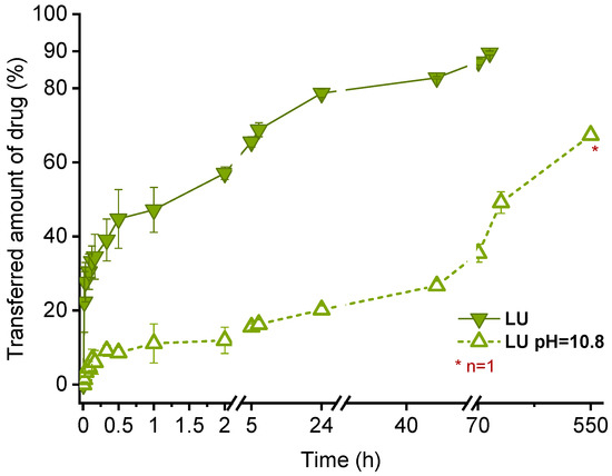 Comparison of lumefantrine transfer before (same data as in Figure 6 but different abscissa scaling) and after pH adjustment. Each value represents mean ± standard deviation (n = 3).