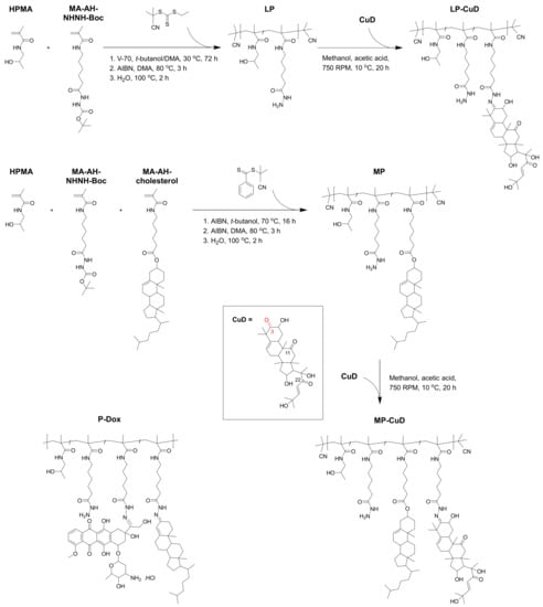 - Chytil, P.; Etrych, T.; Kříz, J.; Šubr, V.; Ulbrich, K. N-(2-Hydroxypropyl)methacrylamide-based polymer conjugates with pH-controlled activation of doxorubicin for cell-specific or passive tumour targeting. Synthesis by RAFT polymerisation and physicochemical characterisation. Eur. J. Pharm. Sci. 2010, 41, 473–482. [Google Scholar] [CrossRef]