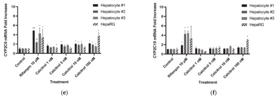 mRNA expression level of cytochrome P450s (CYPs) after treatment with positive control or calcitriol in human cryopreserved hepatocytes and HepaRG cells. (a) CYP1A2; (b) CYP2B6; (c) CYP3A4; (d) CYP2C8; (e) CYP2C9; and (f) CYP2C19. Data are shown as the means ± standard deviations. * p < 0.05, ** p < 0.01, and *** p < 0.001.