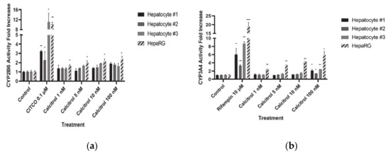 Metabolic activity was measured for CYP2B6 and CYP3A4, which had shown significant and concentration-dependent increases in mRNA levels. Consistent with the qPCR results, a statistically significant increase in CYP2B6 activity was observed in the HepaRG cells, but not in the hepatocytes (Figure 2a). In the case of CYP3A4, its activity increased in a concentration-dependent manner in HepaRG cells, whereas it increased significantly only with the highest concentration of calcitriol (100 nM) in human hepatocytes (Figure 2b). The magnitude of the increased activity was much less than that of the increased mRNA expression.