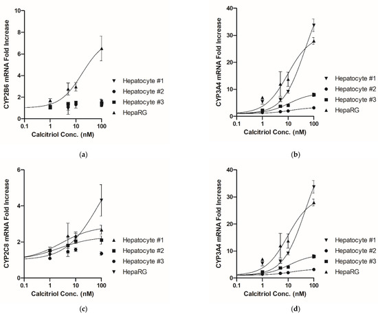 Calcitriol is known to regulate various drug-metabolizing enzymes by binding with the vitamin D receptor (VDR). These metabolizing enzymes include CYP2B6, 3A4, 2C8, and 2C9 [30,50,76]. In the present study, calcitriol induced CYP2B6, 3A4, 2C8, and 2C9 in both hepatocytes and HepaRG cells, and this induction may be VDR-dependent, as reported previously. In the case of CYP2C19, its mRNA expression was upregulated in the presence of 100 nM calcitriol in HepaRG cells only, and a similar increase was not observed in hepatocytes. To the best of our knowledge, it is known that only the pregnane X receptor (PXR) and constitutive androstane receptor (CAR) are involved in the regulation of CYP2C19 and calcitriol is not associated with these transcription factors [77]. The mechanism of CYP2C19 upregulation by calcitriol in HepaRG cells and the reason for the difference in CYP2C19 induction profiles between hepatocytes and HepaRG need to be investigated further to understand the effect of calcitriol on CYP induction more clearly. Nevertheless, CYP induction by calcitriol treatment is not expected to be clinically significant even for CYP2C19 because its mRNA increased only three-fold in the presence of 100 nM calcitriol, which is a much higher concentration than that observed with the dosage regimens used in this study.