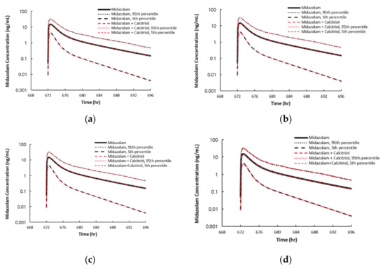 To further clarify the clinical implication of CYP3A4 induction by calcitriol, PBPK modeling was applied as a dynamic mechanistic model. The simulated calcitriol concentration profiles fitted well to the observed profiles after intravenous administration of 74 μg calcitriol (Figure S1 in Supplementary Materials). Using the simulated calcitriol data, the clinical implication of CYP3A4 induction by calcitriol was predicted. The calculated ratio of the PK parameters on day 29 (PK parameters of midazolam divided by the PK parameters of midazolam when coadministered with 74 μg calcitriol on day 29) was 0.9969–0.9998 when using the EC50 and Emax calculated in hepatocytes and HepaRG cells, indicating that 74 μg calcitriol does not affect the pharmacokinetics of midazolam. When sensitivity analysis was performed using various Emax or EC50 values (e.g., 100-fold higher Emax or 100-fold lower EC50), the calculated ratio was similar to 1.00, suggesting that the significance of CYP3A4 induction in clinical settings is likely negligible (data not shown). The PK parameters and concentration–time profiles of midazolam estimated using the PBPK model with or without calcitriol treatment are shown in Table 5 and Figure 4.