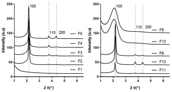 In general, CTAB was used as the template for micelle formation during MSN synthesis []. White powder was formed in MSNs (F1, F2, F3, F4, and F5) using various amounts of CTAB. However, as shown in Figure 1, F1 did not show peaks corresponding to the 100, 110, and 200 hkl Miller indices. This is a characteristic peak of MCM-41 (mobile configuration of substance number 41) MSNs, showing a regular hexagonal pore structure []. When a small amount of CTAB was used (F1), it did not sufficiently form the mesoporous structure of MSNs. On the other hand, the mesostructure of F5 was non-uniform due to excessive CTAB [].