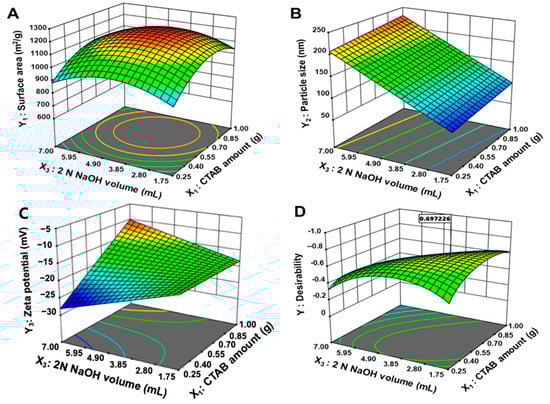 The surface area (Y1) of MSNs results from the formation of aligned pore structures due to the alkoxide hydrolysis of surfactants. The use of small amounts of CTAB increases the rate of alkoxide hydrolysis, resulting in incomplete and small MSNs. In accordance with the literature, the CTAB amount plays a key role in the surface area of MSN. It has been reported that the surface area of MSN shows a tendency to increase along with the increasing CTAB concentration (0.5–4% CTAB) [,,]. In addition, herein, the surface area was increased by increasing the CTAB amount. High concentrations of silica precursors are incompletely hydrolyzed, resulting in reagent residues in the product and the production of silica walls, leading to low surface area []. As a result, it can be said that adjusting the ratio of CTAB and TEOS to an appropriate level is essential for manufacturing MSNs with large surface area. A large surface area can adsorb large amounts of drugs onto MSNs, increasing the amount of drug loaded.