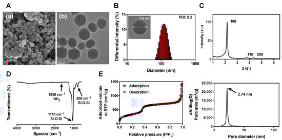 Physicochemical properties of MSNs. (A) (a) SEM image; (A) (b) TEM image; (B) particle size distribution; (C) SAXRD pattern; (D) FT-IR spectrum; (E) nitrogen adsorption–desorption isotherm curve, pore distributions.